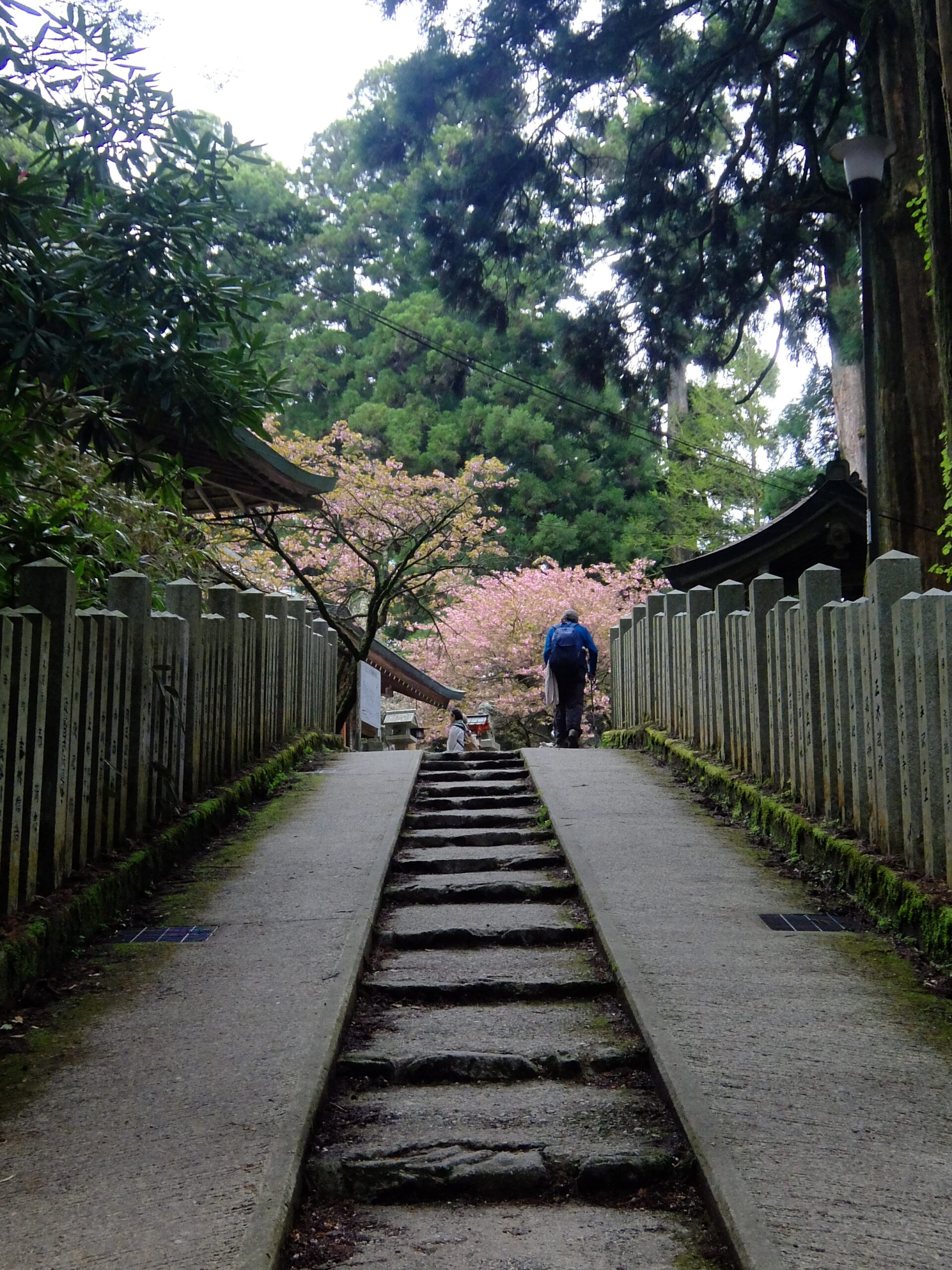 葛木神社への参道。奥におっと思わせるピンクの花が見えていい感じです。