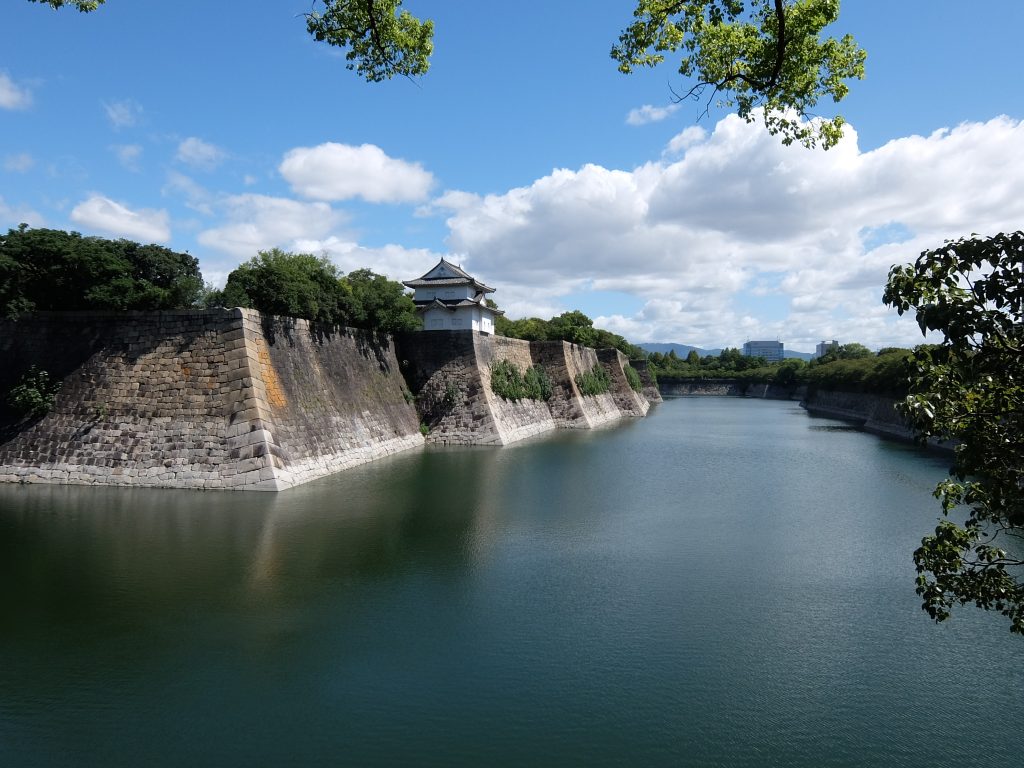 南外堀(みなみそとぼり)の西側には大手口、東には玉造口があり、石垣は約2kmもあるとのことです。かつては櫓(やぐら)が一番から七番まであったそうですが、明治維新の大火や第二次世界大戦の空襲で大半が失われ、今は一番と六番だけになっています。堀の最大幅は75mもあります。石垣が段違いなのは強度を保つためだそうです。