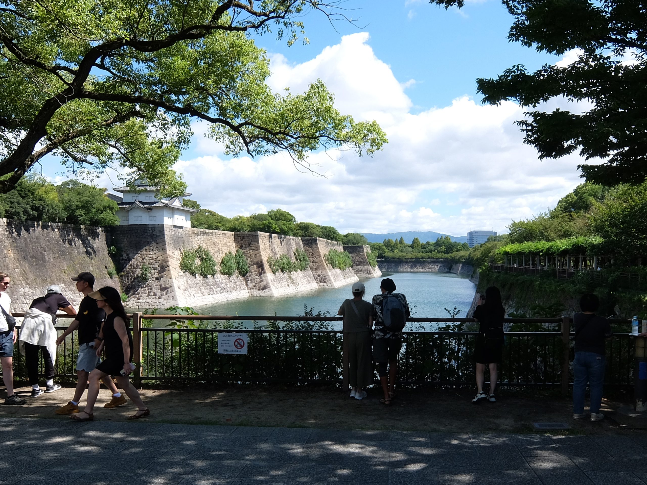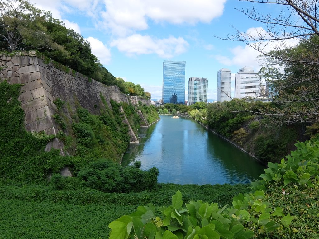 大阪歴史博物館や府警本部のビルが見えてきたところで視界が開け、お堀の緑と長大な石垣が目に入りました。