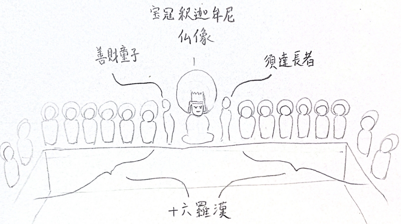 中央に「宝冠釈迦牟尼仏像(ほうかんしゃかむにぶつぞう)」、左に善財童子(ぜんざいどうじ)、右に須達長者(しゅだつちょうじゃ)がおられました。