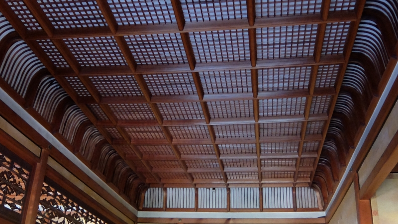 上段の間は格式の高い小組格天井(こぐみごうてんじょう 格天井(ごうてんじょう)の格間(ごうま)の上に、さらに細かい格子を置き、裏板を張った天井)になっていて、部屋は床の間(とこのま)や違い棚(ちがいだな)、帳台構え(ちょうだいがまえ)などのある書院造(しょいんづくり)*となっています。