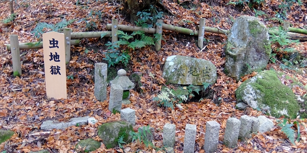 六甲山ロープウェイ乗り場の近くに「虫地獄」の札がある。ほかにも「鳥地獄」やら「炭酸地獄」という札も。