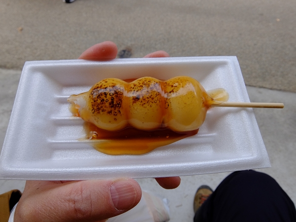 1本300円だが、十分にその価値ありだ。もっちり柔らかい食感は普通のみたらし団子に比べたら段違いに素晴らしい。バーナーで焼きを入れるのもポイントで、香ばしさがたまらなかった。主人によれば100%お米を使っているとのこと。それがどういうことなのか素人にはよくわからないが、ちょっと調べると、一般的には上新粉や白玉粉といった粉を使うらしいから、米を炊いてつぶして練ってつくっているということなのかなと勝手に解釈する。確かによく食べるみたらしは弾力があってそれはそれで食べ応えがあるのだが、この柔らかさを経験すると他のみたらし1本に300円つけているとしたら食べないだろうな。いや食べてみないとわからないから結局食べるか…。