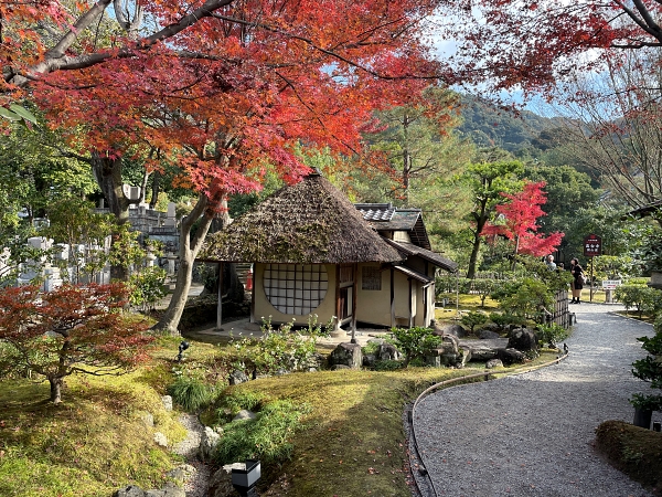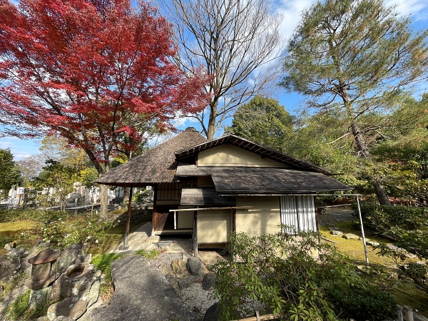 まず目を引くのが木々の合間から見えてくるミニチュアのような茶屋 遺芳庵(いほうあん)だ。近くに建つ鬼瓦席とともに、江戸初期の豪商 灰屋 紹益(はいや じょうえき)の邸宅にあったものを移築したとされる。