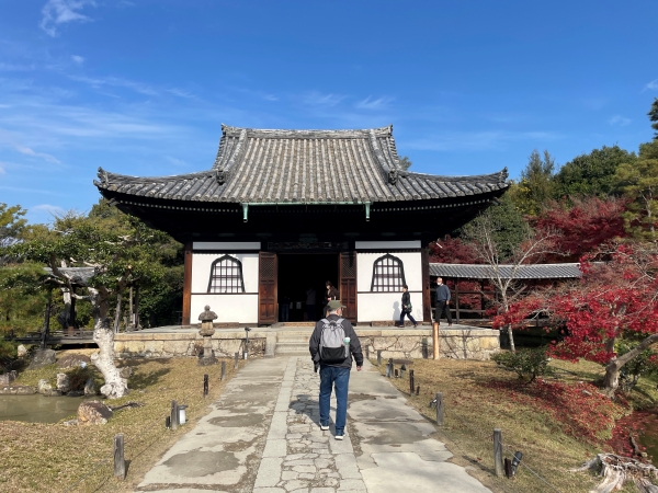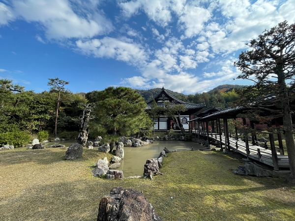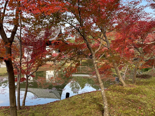 さらに進むと偃月池(えんげつち)が見えてくる。池を渡る回廊の向こうには開山堂が見える。