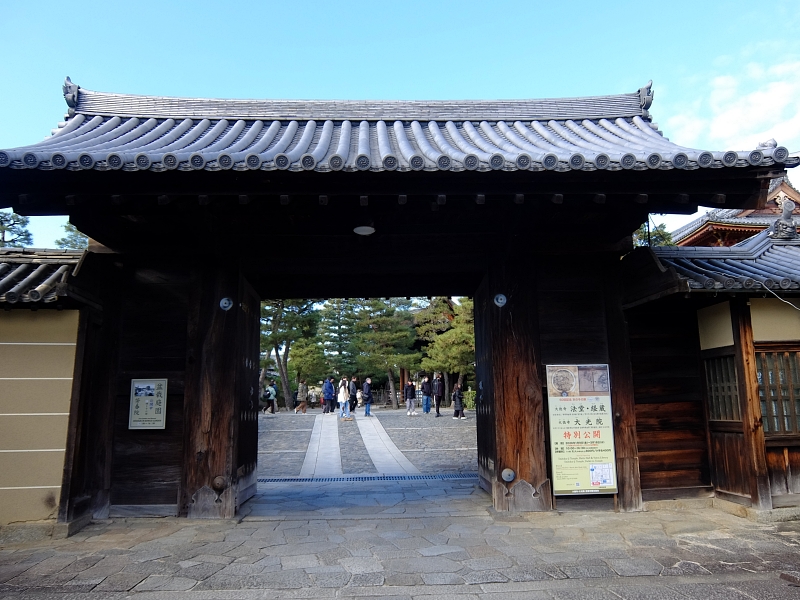 臨済宗大徳寺派の大本山。大燈国師(だいとうこくし 宗峰妙超しゅうほうみょうちょう)が正和4年(1315)に創建。持明院統(北朝)の花園天皇と大覚寺統(南朝)の後醍醐天皇の両方から帰依され、両統の勅願寺となる。応仁の乱で荒廃するが、一休宗純(いっきゅうそうじゅん)が堺商人の支援を背景に再建、第47世住持となる。桃山時代には秀吉が織田信長の葬儀を盛大に執り行う。千利休(せんのりきゅう)の木像が三門(金毛閣 きんもうかく)の上層に安置されたことから秀吉の怒りを買い利休が自刃する事件となる。さらに大徳寺破却の危機に発展したのを制止したのは第117世住持 古渓宗陳(こけいそうちん 蒲庵古渓 ほあんこけい とも)。方丈、方丈玄関、唐門は国宝。方丈庭園は国の史跡および特別名勝。